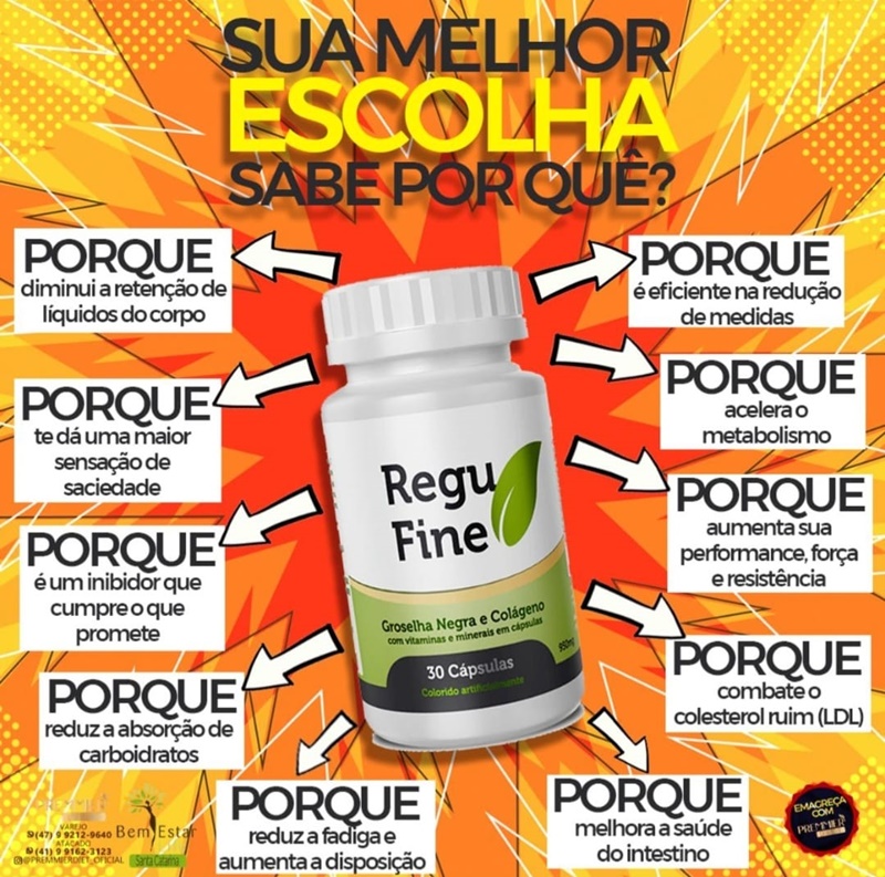 Regu Fine é o líder de vendas para emagrecimento, elaborado com o mais puro substrato da Groselha Negra, costuma surpreender novos clientes e satisfazer os cliente que já o conhece. Além da Groselha Negra, o Regu Fine também traz em sua composição vitaminas e colágeno, fundamental para uma pele bonita. Ele é um suplemento alimentar natural que visa auxiliar pessoas com algum grau de obesidade ou que querem perder peso.
