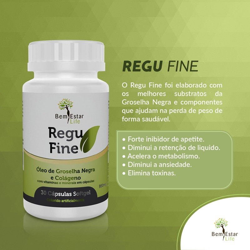 O Regu Fine softgel, foi elaborado com os melhores substratos da Groselha Negra e componentes que ajudam na perda de peso, fazendo com que você emagreça de uma forma saudável, ou seja, sem agredir a saúde. Mantem seu peso ideal.